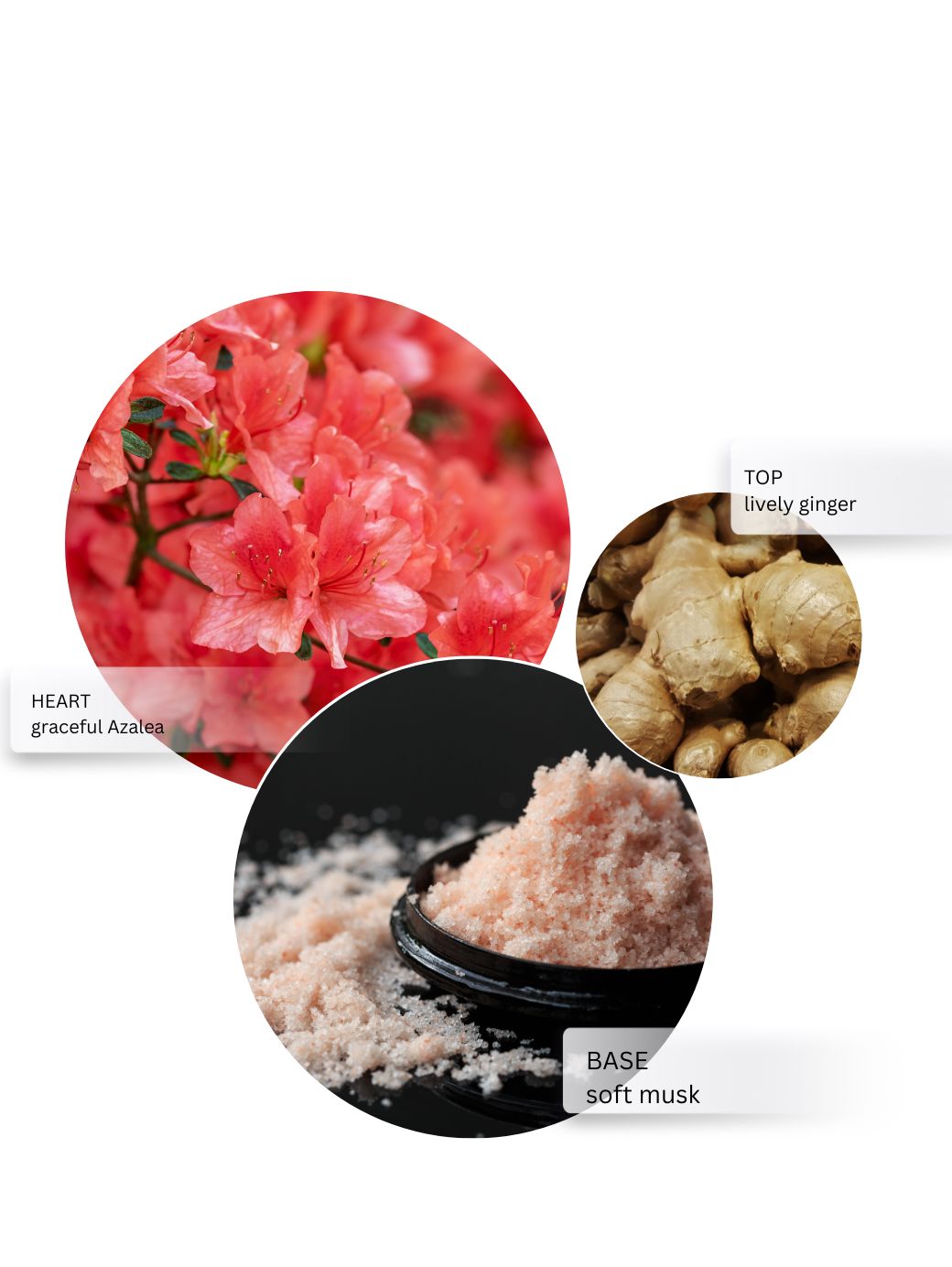 FRAGNANCE NOTES: Velvety azalea blossoms drifting on a whisper of dusk. A spark of ginger ignites the senses, bright and untamed. Soft musk lingers like a gentle caress, wrapping the soul in quiet allure.